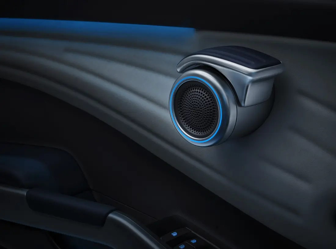 Rotating touchscreen, Apple CarPlay, voice control, 360° camera, adaptive cruise control, and ambient lighting.